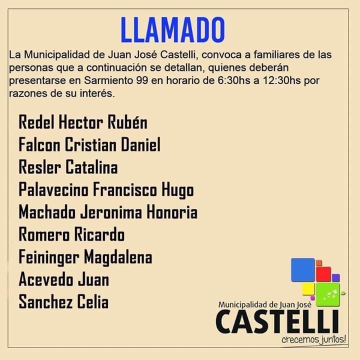 Las familiares/responsables de las personas que a continuación se detallan, deberán presentarse a la brevedad en Mesa de Entradas de la Municipalidad de Juan José Castelli por razones de su interés.-