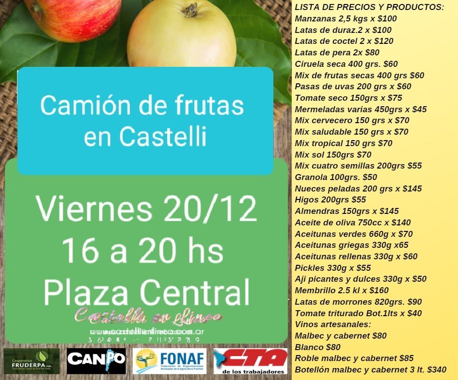 Este viernes 20 de diciembre desde las 16 hs nuevamente llega el camiĂłn de frutas y conservas a Castelli. Estará en la calle Padre Carlos Lauth y Av San MartĂn
