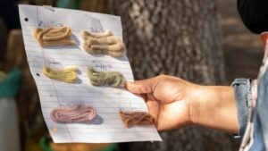 Gracias a un taller de tintes naturales dictado por Natalia Orozco, Veda redescubrió la cantidad de colores que el monte ofrece y que puede utilizar en sus trabajos. Junto con su hija, Melina, se interna en el monte en busca de aquella planta que le de el color justo que está buscando.