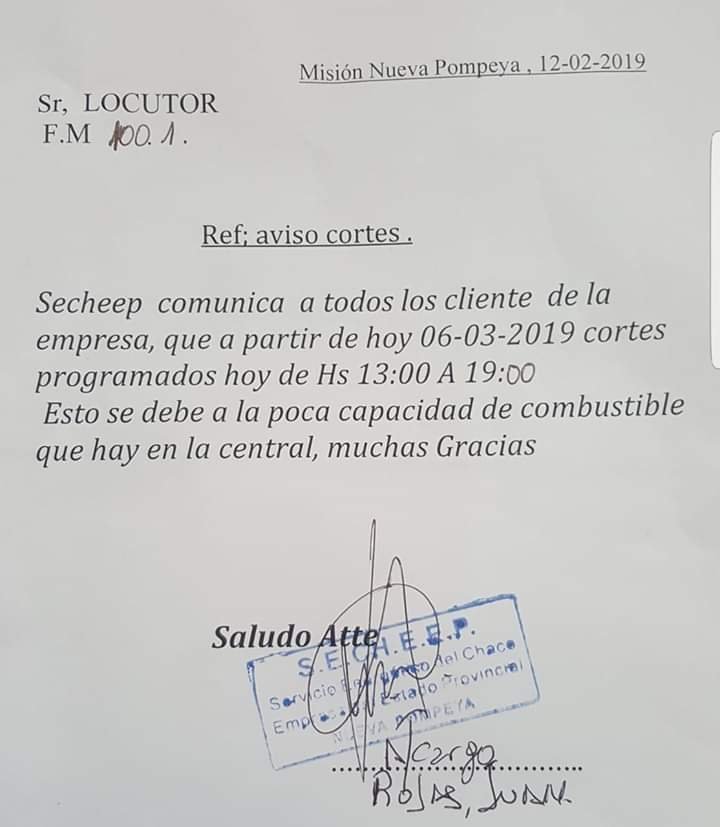 SECHEEP comunica a todos los clientes de la Empresa que a partir de hoy 06-03-2019 cortes programados hoy de hs 13 a 19.