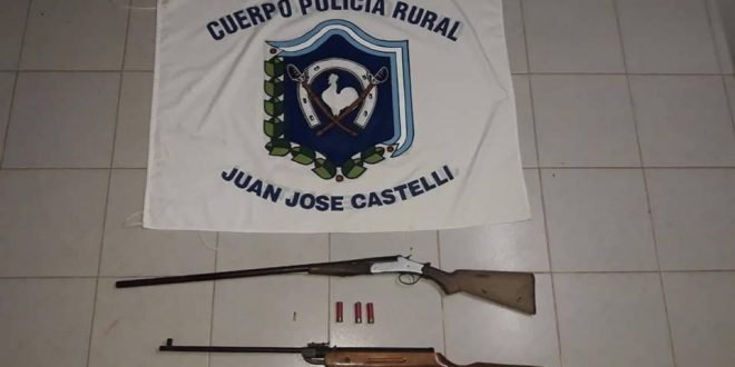La PolicĂa Rural de Castelli, informĂł que una comitiva policial, mientras realizaba una recorrida y control sobre caminos vecinales de los Paraje Malá – La Tolosita de esta JurisdicciĂłn, lograron el SECUESTRO de dos armas de fuego, tratándose de un rifle, tipo aire comprimido, con tubo cañón modificado a calibre 22, marca Krico, serie E100960 con un cartucho, marca OA y una escopeta, calibre 16, solo tubo cañon, marca – serie no visible, tres cartuchos mismo calibre, tratándose de los ciudadanos N. Z. Ddo. Colonia Pampa Tolosita – esta, y A. D. A. (34) – domiciliado en Buenos Aires, ambos practicando caserĂa, sin carnet habilitante para dicha actividad, tal sentido fueron notificados haber Infringido ley de Caza 5629.