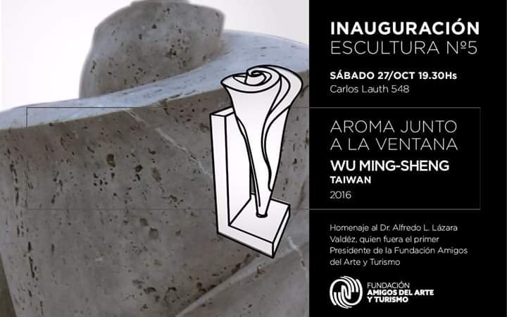 19.30hs ESCULTURA N° 5: Título de la Obra: “Aroma Junto a la Ventana” Autor: Wu Ming Sheng – Taiwán Año: 2016 Ubicación: Carlos Lauth 548 Homenaje al Dr. Alfredo L. Lázara Valdéz, quien fuera el primer Presidente de la Fundación Amigos del Arte y Turismo.