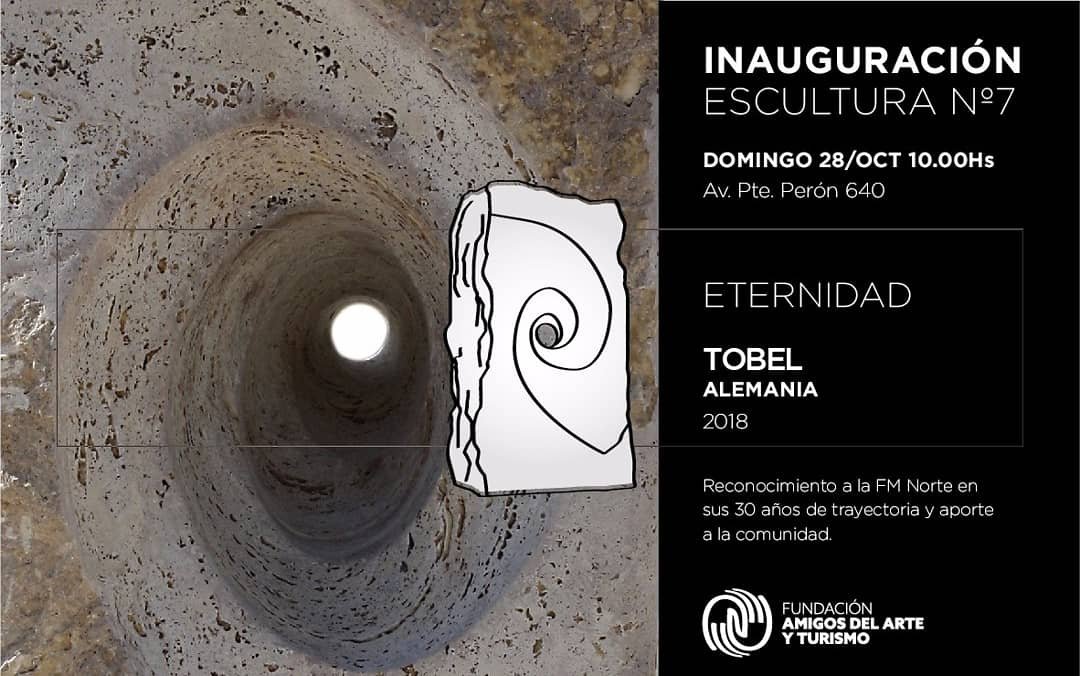 10.00hs ESCULTURA N° 7: Título de la Obra: “Eternidad” Autor: Tobel – Alemania Año: 2018 Ubicación: Avda. Pte. Perón 640. Reconocimiento a la FM Norte, en sus 30 años de trayectoria y aporte a la comunidad.