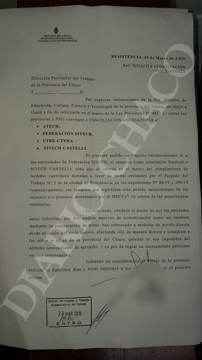Además, desde el Ejecutivo se volvió a insistir en la disputa de entidad para con algunos sindicatos. En ese sentido aclara que el pedido “no reconoce ni a las autoridades de Federación SITECH ni tampoco como Asociación Sindical a SITECH Castelli” y señala que su inclusión en el documento “se efectúa en el marco de medidas cautelares dictadas a favor de ambas entidades por el Juzgado del Trabajo N° 3 de la ciudad de Resistencia”.