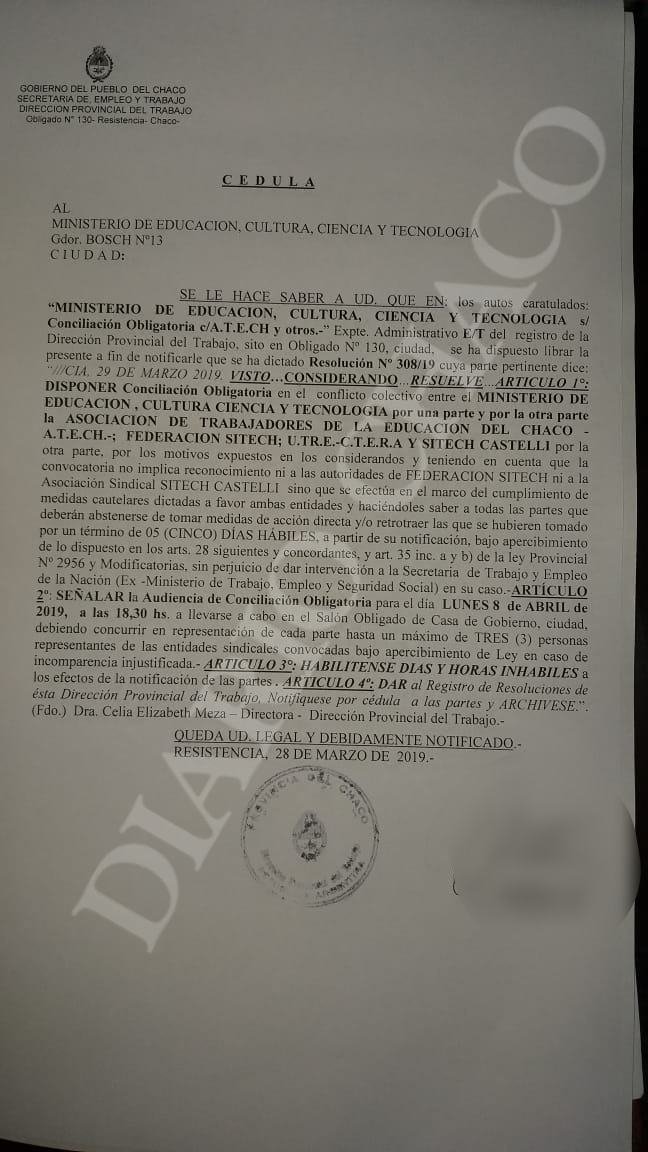 La cédula de notificación ya fue enviada a cada organización sindical y establece una audiencia entre las partes el próximo lunes 8 de abril, a las 18.30, en el Salón Obligado de Casa de Gobierno.