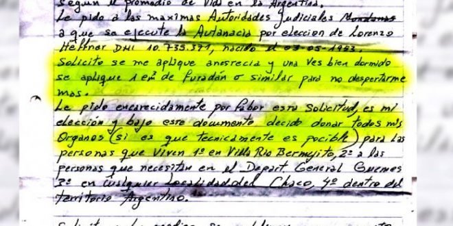 Por otra parte, pidió que sus órganos, de ser posibles, sean donados. “Le pido encarecidamente por favor esta solicitud, es mi elección y bajo este documento decido donar todos mis órganos (si es que técnicamente es posible) para las personas que viven primero, en Villa Rio Bermejito, segundo, a las personar que necesiten del departamento Güemes, tercero para personas del Chaco y cuarto dentro del territorio Argentina”, puntualizó.