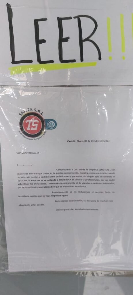 La Empresa SAFITA que brinda el servicio de Viandas y Comida en el Hospital del Bicentenario de Castelli ya cortĂł el servicio a los Profesionales del Nosocomio.