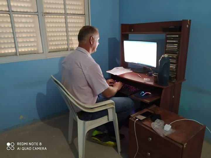 El propio Intendente sentado en sillas de plástico frente a la computadora lleva adelante la confección del proyecto.