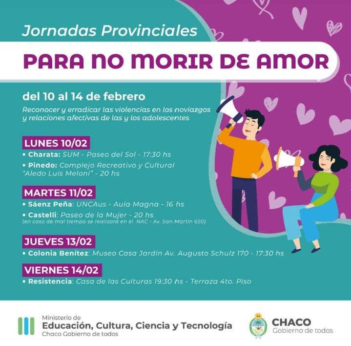 En Castelli la Jornada Provincial para reconocer y erradicar las violencias en los noviazgos y relaciones afectivas de las y los adolescentes será el martes 11 de febrero a las 20 hs en el Paseo de La Mujer.