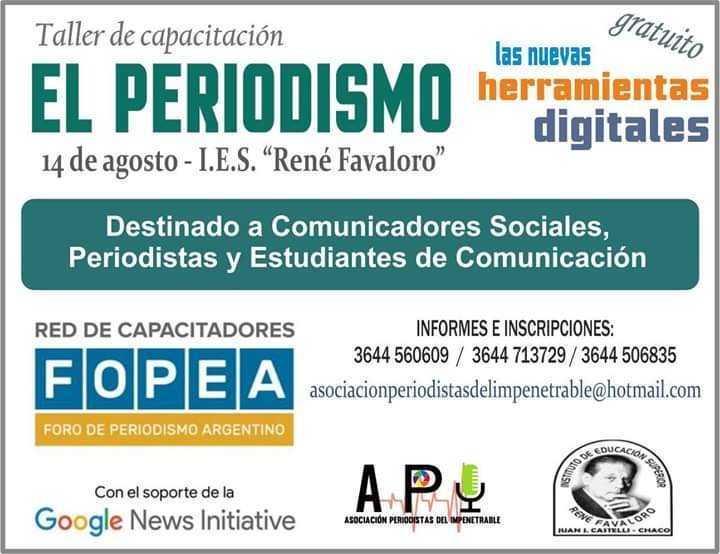 La jornada se encuadra en el marco de las acciones impulsadas en todo el país por la Red de Capacitadores del Foro de Periodismo Argentino – FOPEA – con el soporte de Google New Initiative. En este sentido, en Castelli se dictará una taller intensivo de capacitación sobre el Periodismo y las nuevas tecnologías el próximo miércoles 14 de agosto en el Instituto de Educación Superior “René Favaloro”.
