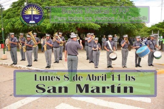 Será este lunes 8 de abril a las 11:00 hs en la Plaza San Martin. Invitan a todos los vecinos de la Ciudad de Juan José Castelli a disfrutar del Concierto en Vivo de la Banda Musical del Servicio Penitenciario Provincial. La demostración se da en el Marco del XI Aniversario del Servicio Penitenciario y de Readaptacion Social.