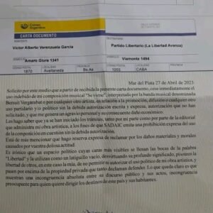 “Solicito por este medio que a partir de la recibida carta documento cese inmediatamente el uso indebido de mi composición musical ‘Se viene’, interpretada por la banda musical denominada Bersuit Vergarabat o por cualquier otro artista, en relación a la promoción, difusión o cualquier otro uso partidario y/o político sin la debida autorización escrita y expresa, autorización que no han solicitado, y que me genera un agravio personal y su consecuente daño económico.