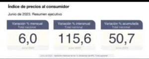 El Instituto Nacional de Estad铆sticas y Censos public贸 un nuevo 脥ndice de Precios al Consumidor (IPC) y marc贸 un 6% de variaci贸n para el mes de junio. De esta manera acumul贸, 50,7% en lo que va del a帽o y una variaci贸n de 115,6% interanual .