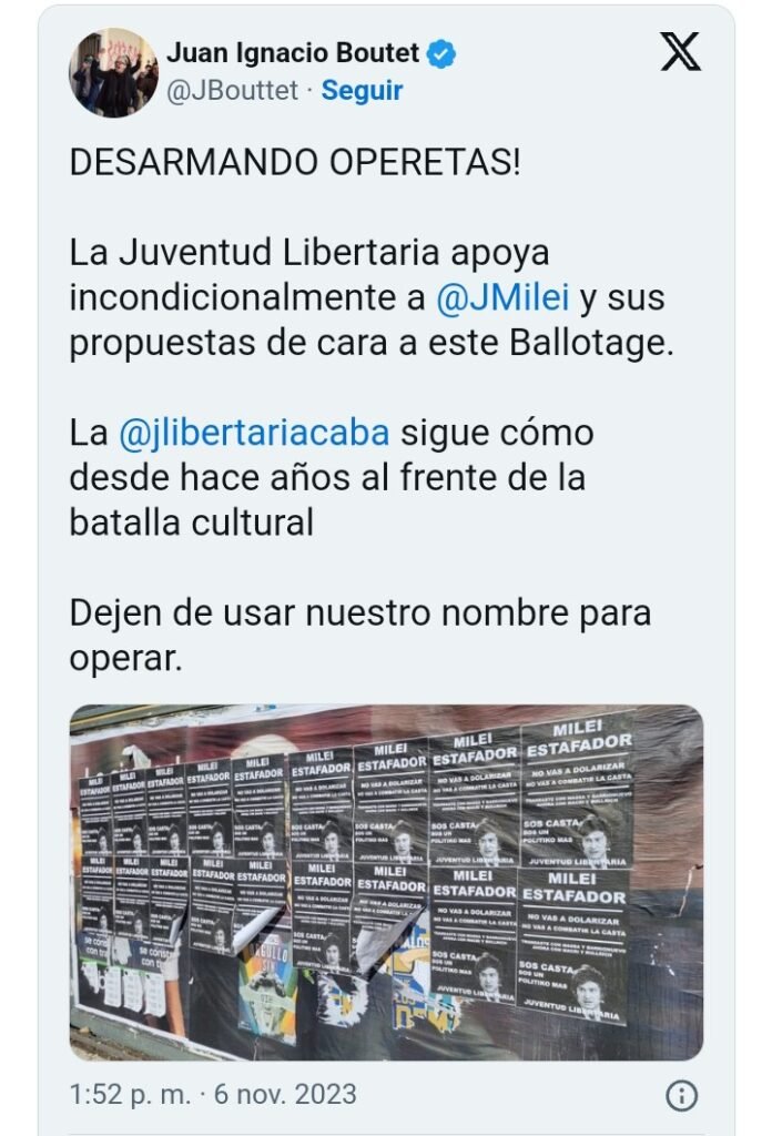 El fundador de la agrupación tuiteó hoy: «¡Desarmando operetas! La Juventud Libertaria apoya incondicionalmente a Javier Milei y sus propuestas de cara a este Ballotage. La Juventud Libertaria sigue cómo desde hace años al frente de la batalla cultural Dejen de usar nuestro nombre para operar».