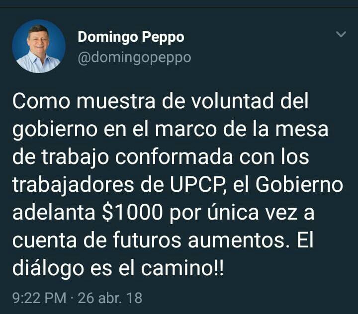 El gobernador Domingo Peppo informó que los trabajadores públicos provinciales percibirán un adelanto de mil pesos por única vez, como adelanto de futuros aumentos, como resultado del diálogo mantenido el miércoles entre funcionarios del gobierno y la UPCP.