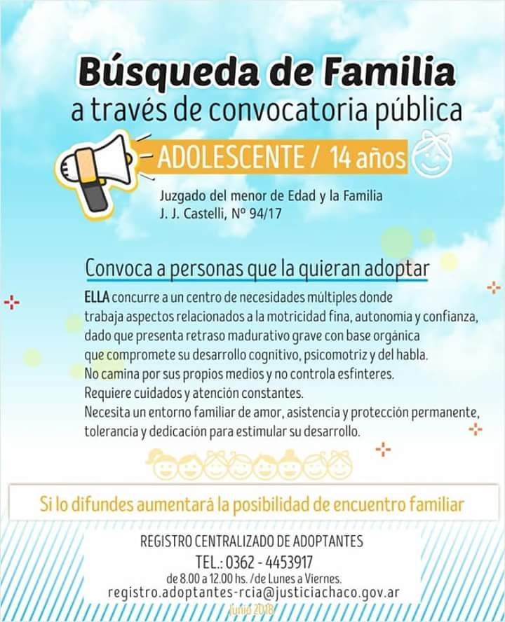 El Juzgado del Menor de Edad y la Familia de Juan José Castelli convoca a quienes estén dispuestos a adoptar a una adolescente de 14 años que presenta diagnóstico de retraso narrativo grave con base orgánica que compromete su desarrollo cognitivo, psicomotriz y del habla, asiste a un centro de necesidades múltiples donde trabaja aspectos relacionados a la motricidad fina, autonomía y confianza.
