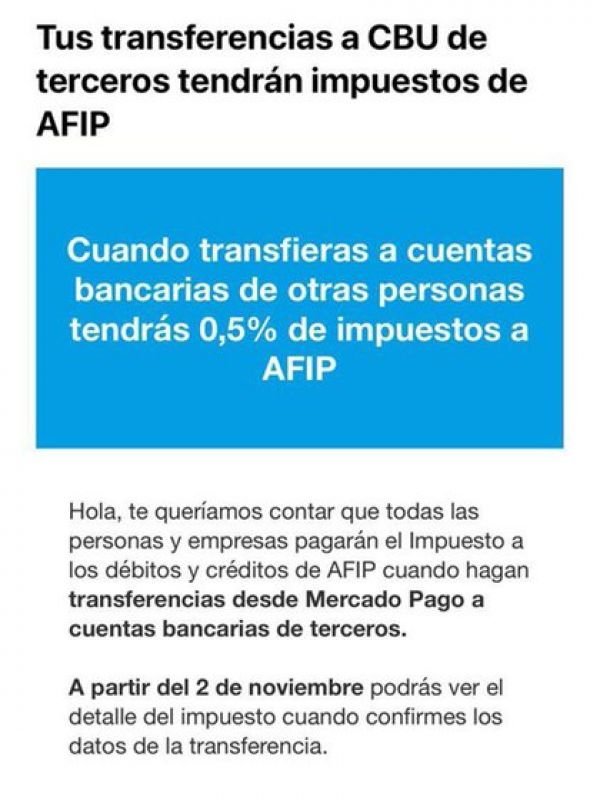 En un breve y sorpresivo comunicado, Mercado Libre informó a sus clientes que a partir de noviembre «cuando transfieras dinero a cuentas bancarias a otras personas tendrás 0,5% de impuestos de la AFIP». La nota agrega que, desde el mes que viene, «todas las personas y empresas pagarán el Impuesto a los débitos y créditos de la AFIP cuando hagan transferencias desde Mercado Pago (la billetera digital de la compañía) a cuentas bancarias de terceros». El mail no aclaraba que se trata de una nueva función de la plataforma, que efectivamente está alcanzada por el llamado impuesto al cheque.