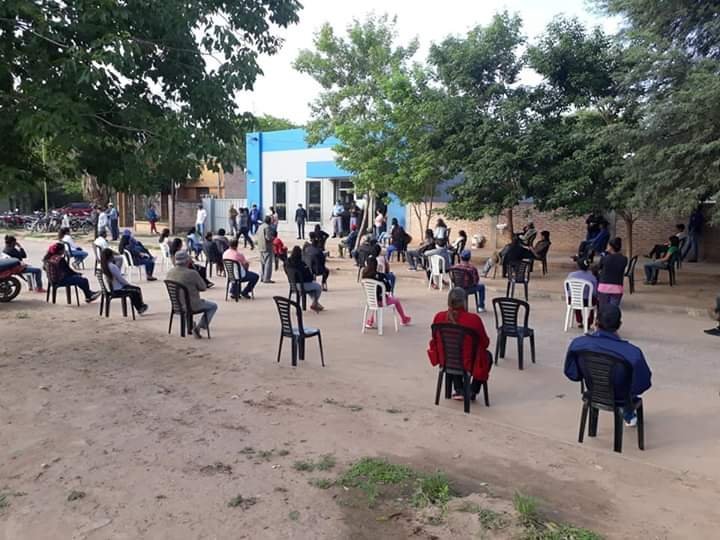 El Personal Municipal trabaja desde esta mañana en la Sucursal del NBCH de la localidad en el ordenamiento de las personas para prevenir el contagio del CODIV-19.