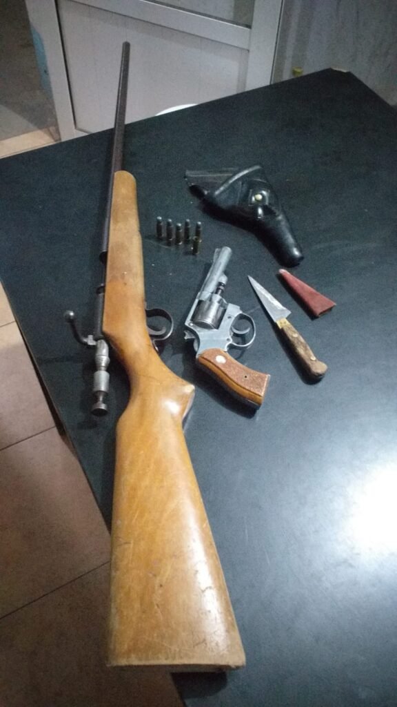 Efectivos policiales concurrieron al domicilio, ubicado en paraje Pato Gómez, donde redujeron al agresor de 40 años y realizaron el secuestro de una escopeta calibre 12 mm., un revolver calibre 32 mm. Cinco cartuchos del mismo calibre, una vaina servida y un cuchillo.