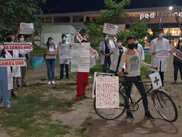 Al ser consultada específicamente por las razones, una médica explicó: «Estamos protestando porque estamos cansados de que nos criminalicen y nos acusan como si nosotros tenemos algo que ver con la difusión de la pandemia y no la inutilidad de las medidas que han tomado. Estamos hartos de que judicialicen cada palabra o cosa que decimos», contestó en un grado de enojo.