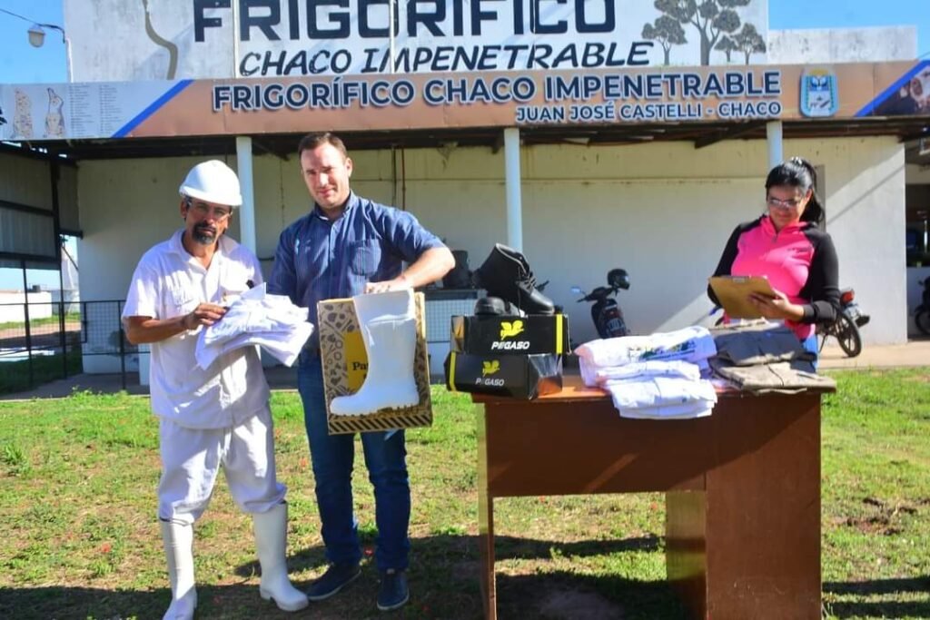 En la jornada de este martes 15 de noviembre, el secretario de Gobierno Ismael Pablo Barnes acompañado del Gerente del Frigorífico Oscar Konrad el representante gremial Omar Arriola, realizaron la entrega de indumentaria de trabajo al personal del Frigorífico.