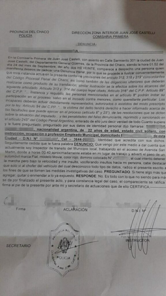 Según consta en la denuncia realizada por el Inspector de Transito quien estaba cumpliendo con su deber y velando por la salud y seguridad de los castelenses. «Siendo las 00:40 de este jueves se aproxima un Automovil Fiat Mobie color Rojo (cuya patente fue identificada) al cual intenta detener para realizar las preguntas y control según protocolo. Por su parte el chófer aminoró la velocidad y sin detenerse realizó insultos y huyó del lugar».