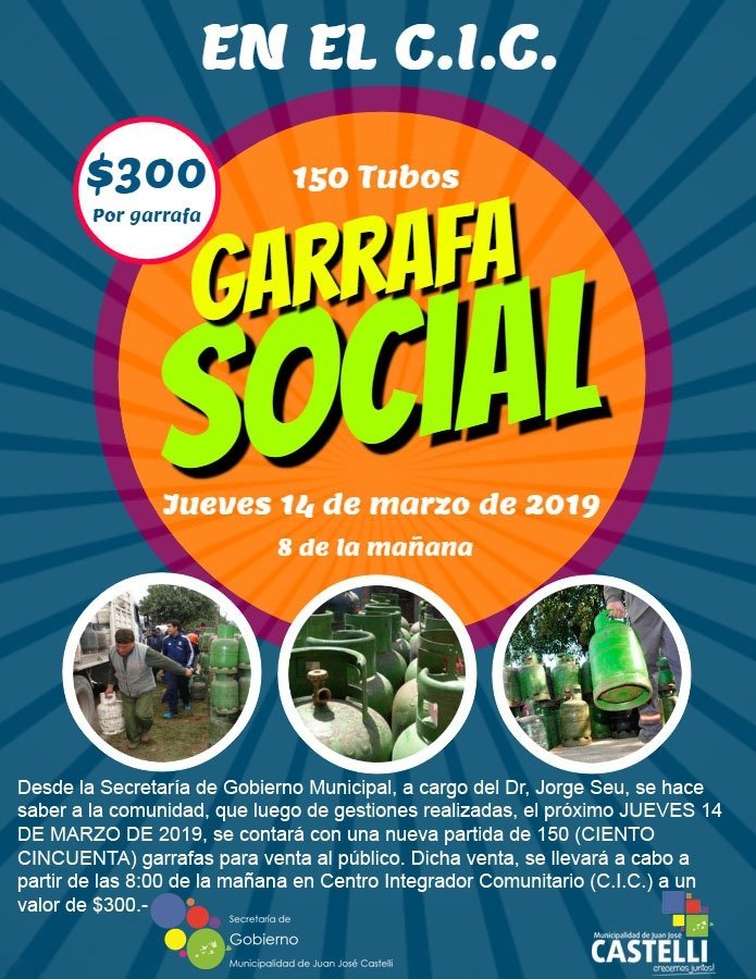 Desde la Secretaría de Gobierno Municipal, a cargo del Dr, Jorge Seu, se hace saber a la comunidad, que luego de gestiones realizadas, el próximo Jueves 14 de Marzo de 2019, se contará con una nueva partida de 150 garrafas para venta al público.