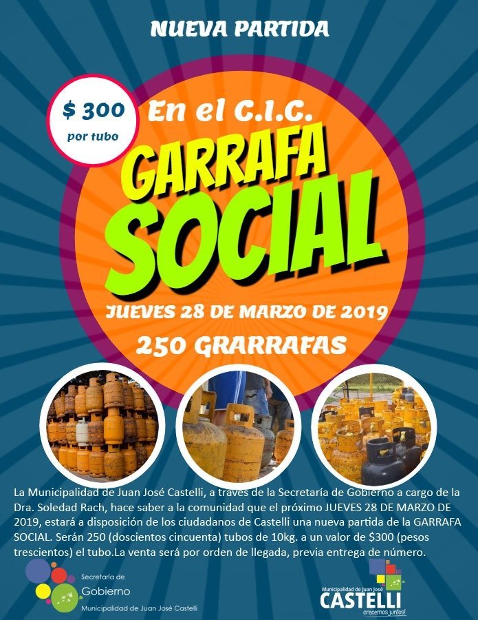 La Municipalidad de Juan José Castelli hace saber a la comunidad que a través de gestiones realizadas por el área de comercio del Municipio y en articulación con la Secretaria de Gobierno, Dra. Soledad Rach y el acompañamiento y colaboración del personal de la Secretaría de Relaciones con la Comunidad el día jueves 28 de marzo a las 8 hs en el CIC, llega una nueva partida de 250 garrafas social a $300 de la Empresa Amarilla Gas.