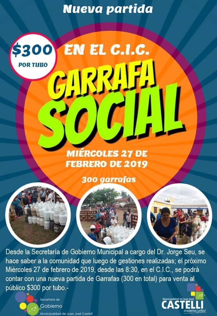 Desde la Secretaría de Gobierno Municipal, a cargo del Dr, Jorge Seu, se hace saber a la comunidad, que luego de gestiones realizadas, el próximo MIÉRCOLES 27 DE FEBRERO DE 2019, se contará con una nueva partida de 300 (trescientas) garrafas para venta al público.
