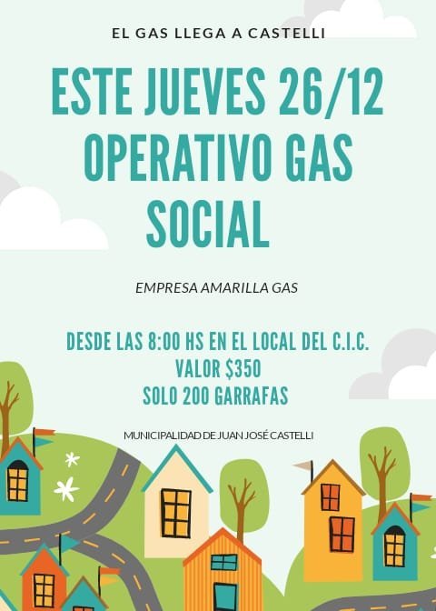 La Municipalidad de Juan José Castelli, hace saber a la comunidad que éste jueves 26 de diciembre, desde las 8:00hs, estará disponible para la venta una nueva partida de 200 garrafas de 10kg en el Centro Integrador Comunitario (C.I.C.) a un valor de $350, de la Empresa Amarilla Gas.