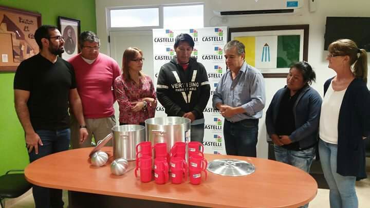 Junto a los secretarios de Gobierno Jorge Seu, de Desarrollo Social Lura González, de Relaciones con la Comunidad Carlos Vallejos y la Subsecretaria de la Mujer Norma Sander, el intendente Alberto Nievas hizo entrega de dos ollas y jarritos para el merendero de la chacra 31 a cargo de Omar CelĂn.