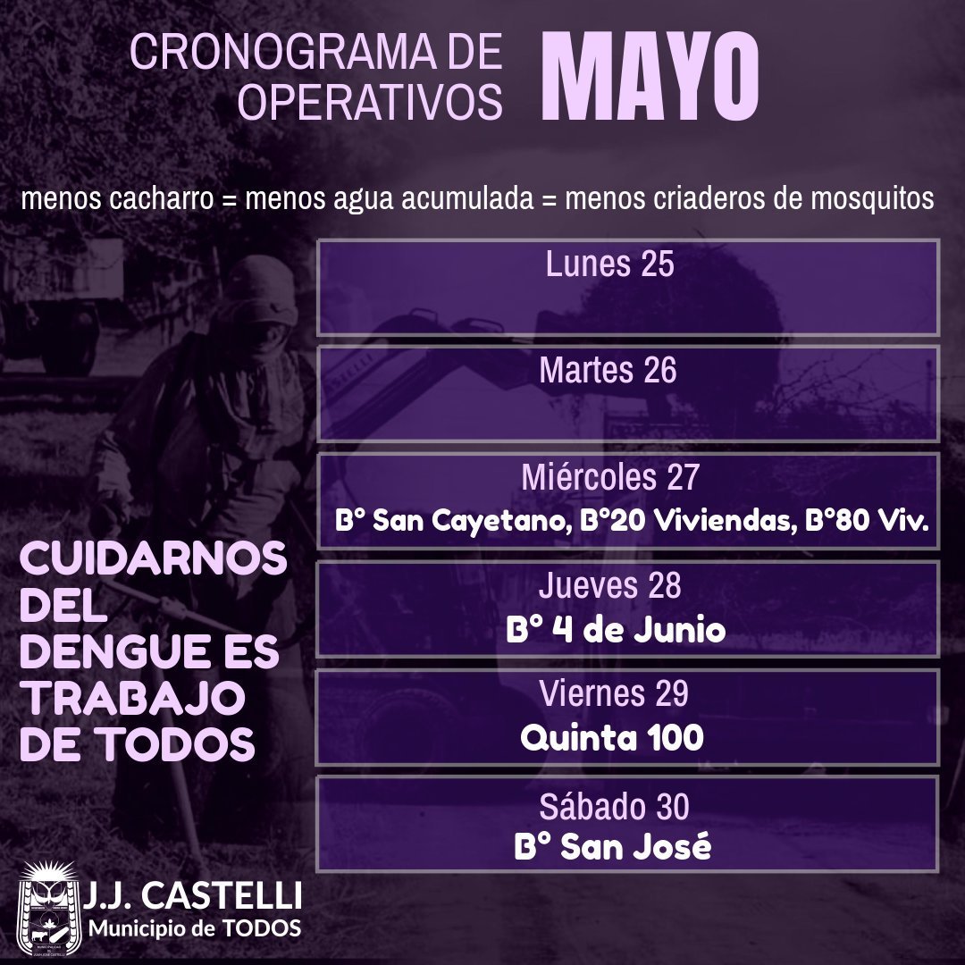 El programa previsto para esta semana es este miercoles 27 en Barrio San Cayetano, 80 Viviendas y 20 Viviendas. Jueves 28 en Barrio 4 de Junio, viernes 29 en Quinta 100 y sabado 30 en Barrio San José