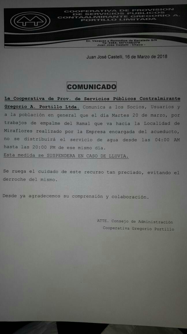 La Cooperativa de Servicios Públicos Contralmirante Gregorio A Portillo Ltda comunica que debido a trabajos en el empalme hacia la localidad de Miraflores que realizará la empresa encargada del acueducto no se distribuirá el servicio el martes 20 de marzo de 04 AM a 20 PM. Se suspende dicha medida en caso de lluvia.