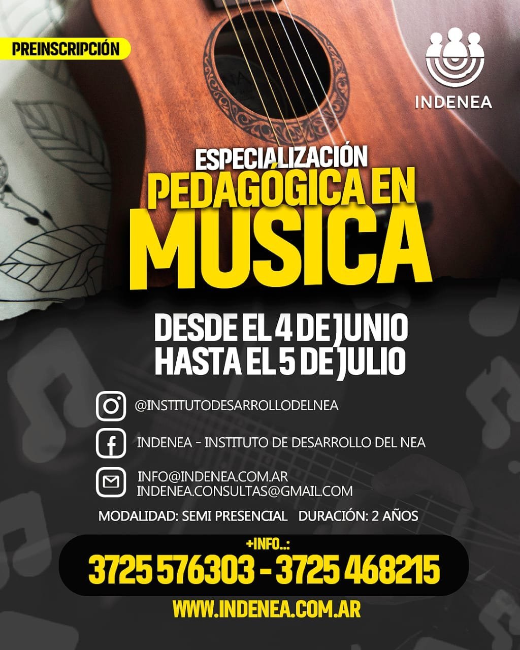 - Especialización Pedagójica en Música con modalidad semi presencial y una duración de 2 años, pre inscripciones desde el 04 de junio al 05 de julio.