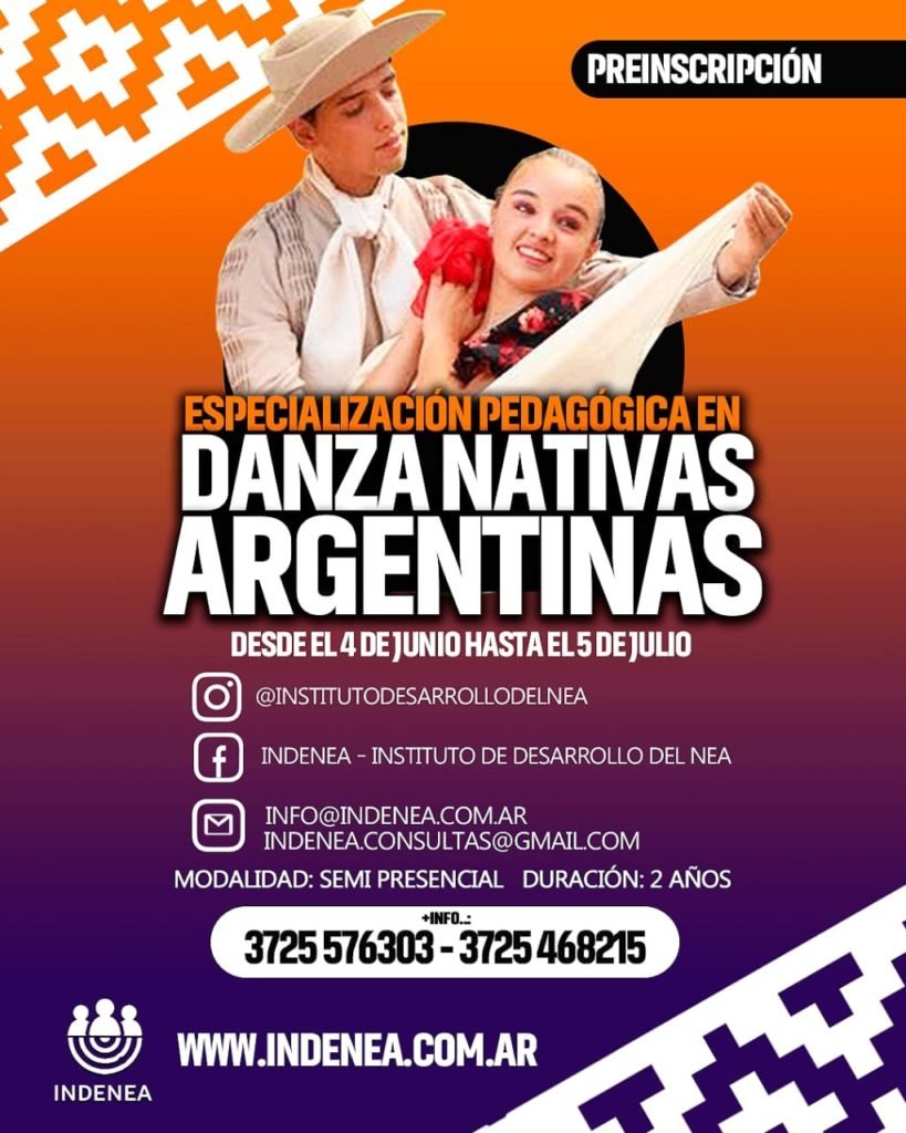 - Especialización Pedagójica en Danzas Nativas Argentinas con modalidad semi presencial y duración de 2 años, pre inscripciones del 04 de junio al 05 de julio.