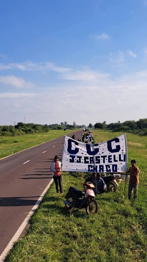 Manifestantes de la organización social CCC encabezan una protesta a la vera de la Ruta Nacional 95, en el acceso sur de Castelli, en el marco de la jornada provincial de lucha.