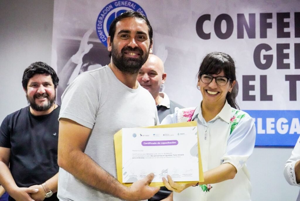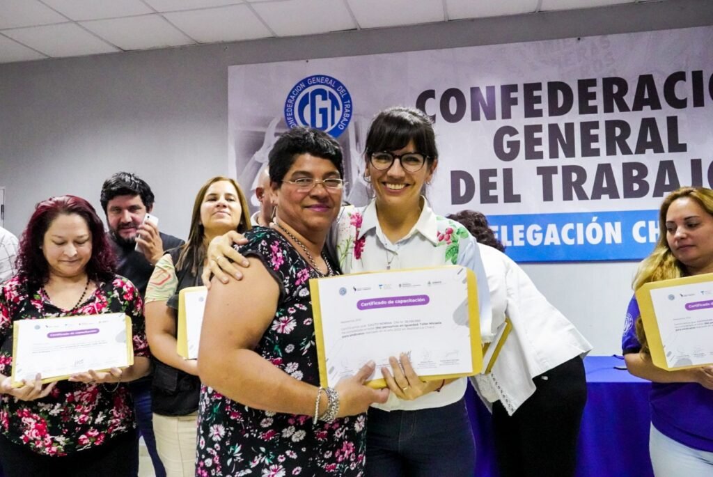 Bajo el nombre “(Re) Pensarnos en Igualdad”, la propuesta nació por un convenio firmado entre el Gobierno provincial, a través de la Secretaría de Derechos Humanos y Géneros, el Centro de Estudios de Género y Feminismos de la UNCAUS y la CGT Chaco. Es por ello que la vicegobernadora encabezó la entrega de certificados a quienes completaron los talleres de manera completa, acompañada por los delegados Regionales de la CGT, Adrián Bellomi e Isaias Alegre.