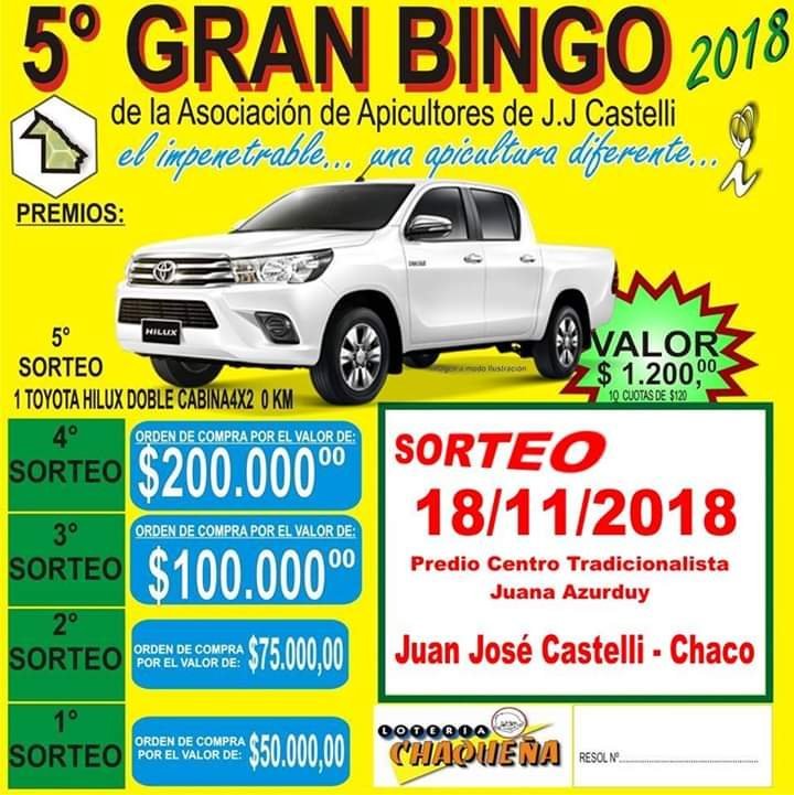 El próximo 18 de noviembre llega el sorteo del Gran Bingo de la Asociación de Apicultores de Juan José Castelli.