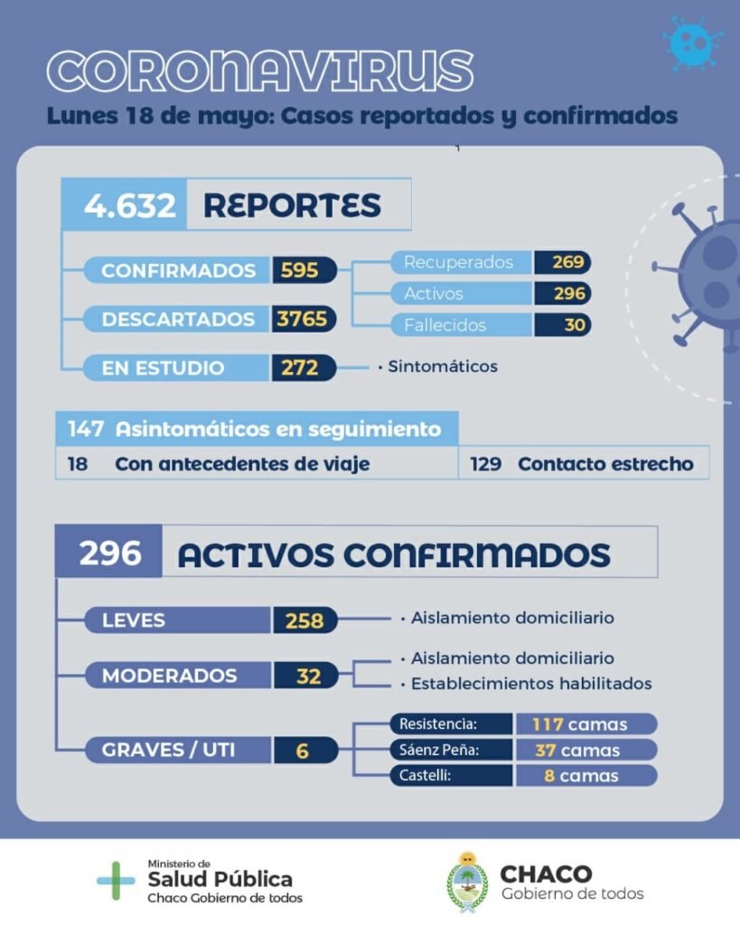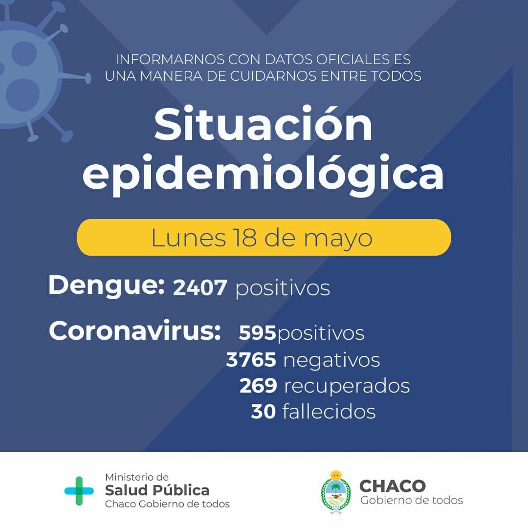 El Ministerio de Salud Pública del Chaco informa que hasta este lunes 18 de mayo se reportaron 595 casos positivos de COVID-19, de los cuales 269 pacientes recibieron el alta médica definitiva y se produjeron 30 fallecimientos. En tanto hay 2.407 personas con dengue en el territorio provincial.