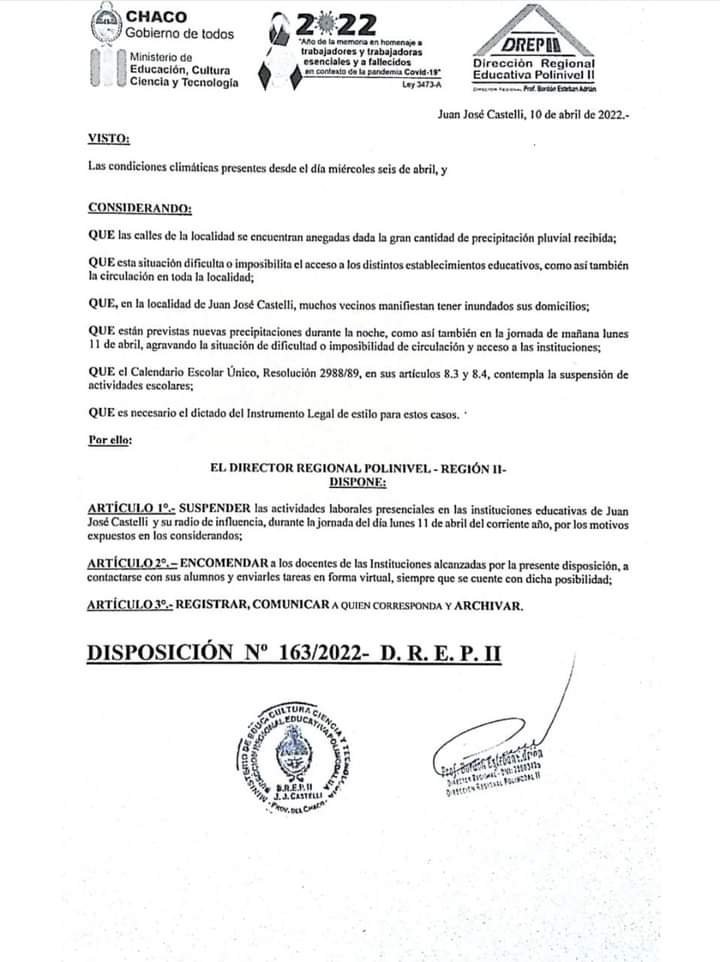 Una nueva Disposición de la Dirección Regional Educativa II confirma la suspensión de las actividades escolares en Castelli para este lunes 11 de abril, debido a las circunstancias generadas por las condiciones climáticas de las últimas horas.