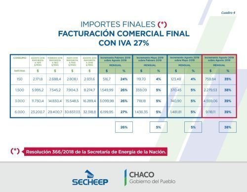 Los nuevos precios están establecidos en la Resolución 366/2018 ya fueron publicados en el Boletín Oficial a inicios de 2019, tras ser rubricados el 27 de diciembre del año pasado. La normativa establece un aumento escalonado en tres etapas: febrero, mayo y agosto, por un total cercano al 55 por ciento. “Al traspasar esos costos al usuario, la suba queda aproximadamente en un 37% para cada familia chaqueña, en tanto que los porcentajes serían parecidos tanto para los usuarios comerciales como para los pequeños industriales”, ratificó Tayara.