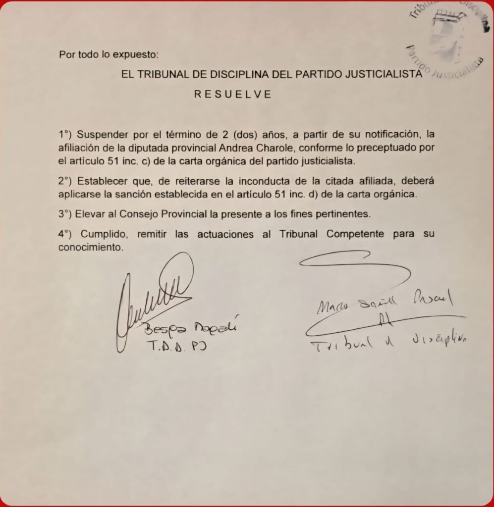 | La diputada provincial Andrea Charole fue suspendida por dos años en su afiliación al Partido Justicialista tras los incidentes ocurridos el 20 de agosto en la sesión legislativa sobre la cláusula gatillo para docentes. Durante el debate se produjo una fuerte discusión por la votación, que derivó en acusaciones cruzadas entre oficialismo y oposición. Finalmente, el proyecto fue habilitado tras reconsiderar la moción.