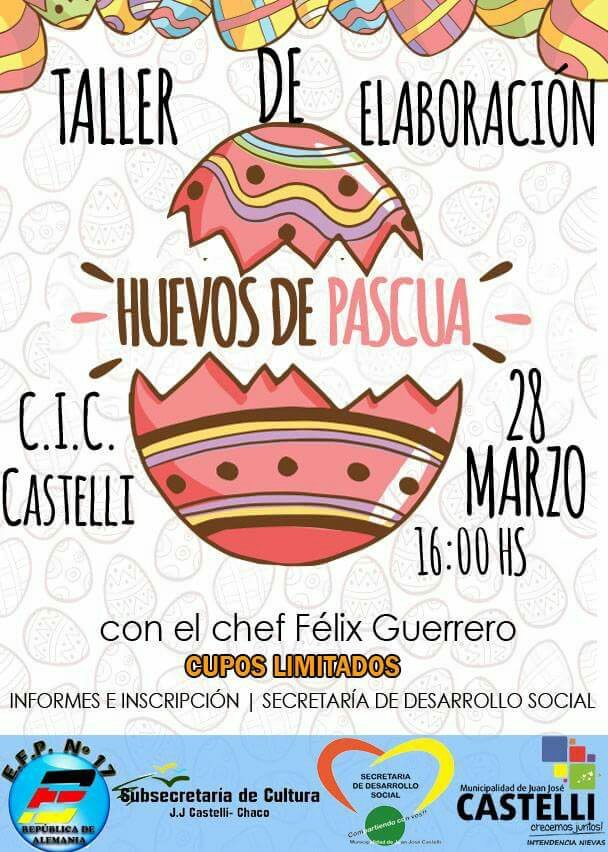 El próximo 28 de marzo, el Chef Félix Guerrero brindará un Taller de Elaboración de Huevos de Pascua. El mismo está organizado y coordinado por la Municipalidad de Castelli, a través de la Secretaría de Desarrollo Social, Subsecretaría de Cultura y la E.F.P. Nº 17 República de Alemania, se desarrollará en el Centro Integrador Comunitario (C.I.C.) a la hora 16, TOTALMENTE GRATUITO y con CUPOS LIMITADOS.