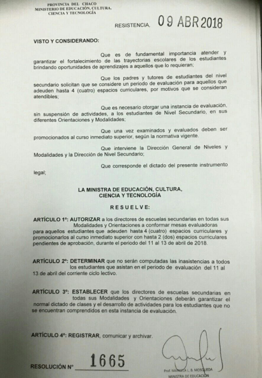 La Directora Regional Educativa Polinivel V Licenciada Marta Marsall dio a conocer la Resolución 1665 del Ministerio de Educación, Cultura, Ciencia y Tecnología de la Provincia del Chaco por la cual se autoriza a Directores de Escuelas Secundarias de todas sus Modalidades y Orientaciones a conformar mesas evaluadoras para aquellos estudiantes que adeudan hasta cuatro períodos curriculares y promocionar al siguiente curso inmediato a aquellos estudiantes con hasta dos espacios curriculares pendientes de aprobación.