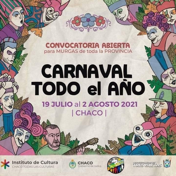 El área de Cultura de la Municipalidad de Tres Isletas informa que a partir del 19 de julio y hasta el 2 de agosto se encuentra abierta la primera convocatoria de acompañamiento a producciones artísticas de agrupaciones murgueras de nuestra provincia.