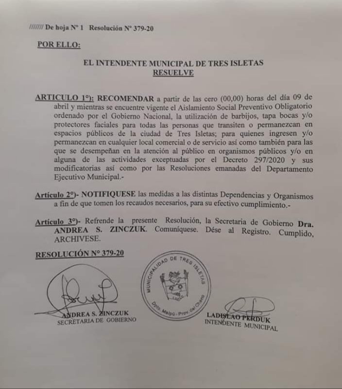 La municipalidad de Tres Isletas bajo resolución 379/20 comunica que a partir del 09/04/20 y desde la hora 00 hs se encuentra vigente el Aislamiento Social Preventivo Obligatorio ordenado por el Gobierno Nacional. RECOMIENDA la utilización de barbijos, tapabócas, y/o protectores faciales para todas las personas que transiten o permanezcan en espacios públicos de la Ciudad de Tres Isletas, para quienes ingresen y/o permanezcan en cualquier local comercial, en atención al público, en alguna actividad exceptuadas en el decreto 297/2020.
