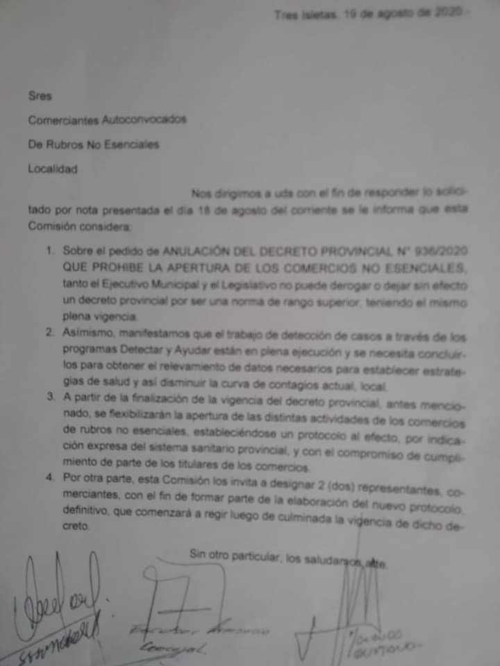 TRES ISLETAS: LOS COMERCIOS NO ESENCIALES DEBEN CONTINUAR CERRADOS HASTA EL 23 DE AGOSTO Y DESDE EL LUNES 24 COMENZARÁ A REGIR EL NUEVO PROTOCOLO CONSENSUADO
