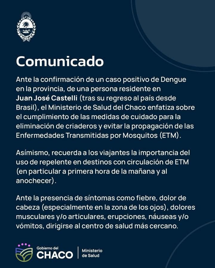 El Ministerio de Salud confirmó un caso positivo de Dengue en Juan José Castelli, correspondiente a una persona que regresó recientemente de Brasil. Ante esta situación, las autoridades sanitarias refuerzan la importancia de cumplir con las medidas de prevención para evitar la propagación del virus. «Es fundamental eliminar criaderos de mosquitos y extremar el uso de repelente para reducir los riesgos de contagio» , señala el comunicado.