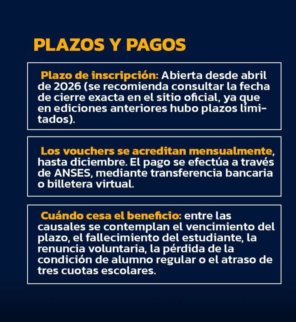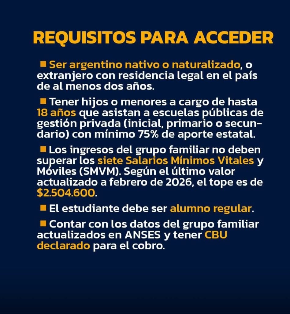 El beneficio busca acompañar el pago de las cuotas escolares de estudiantes de hasta 18 años que cursen los niveles inicial, primario y secundario en escuelas con al menos 75% de aporte estatal 📊