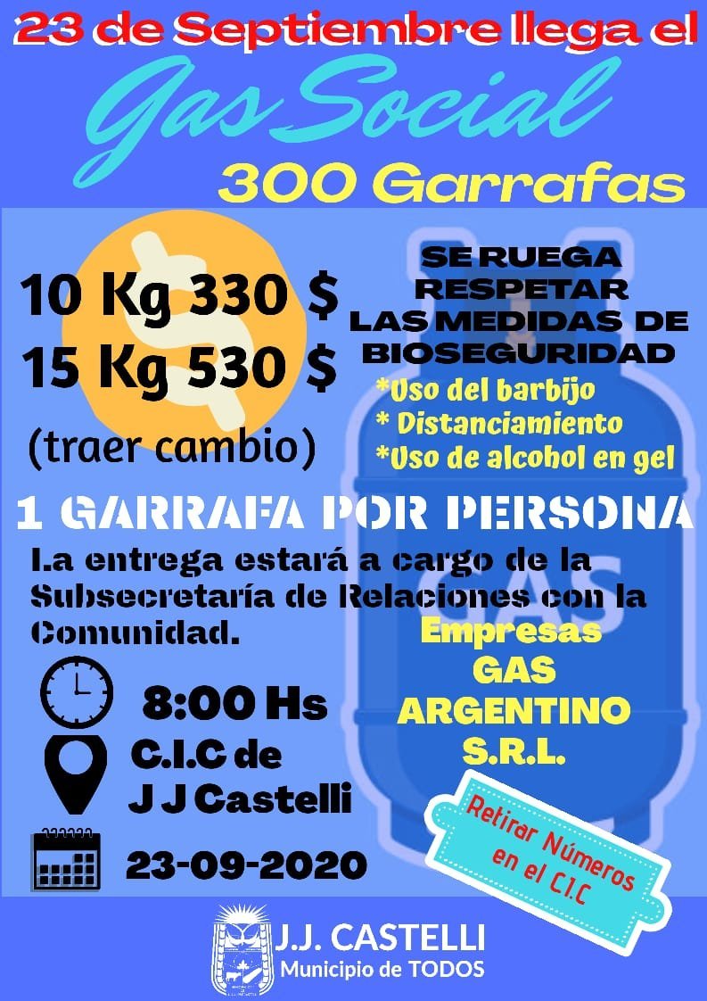 Este miércoles 23 de septiembre llega un nuevo operativo de la garrafa social a Castelli por gestiones realizadas por el Intendente Pio Sander. Â